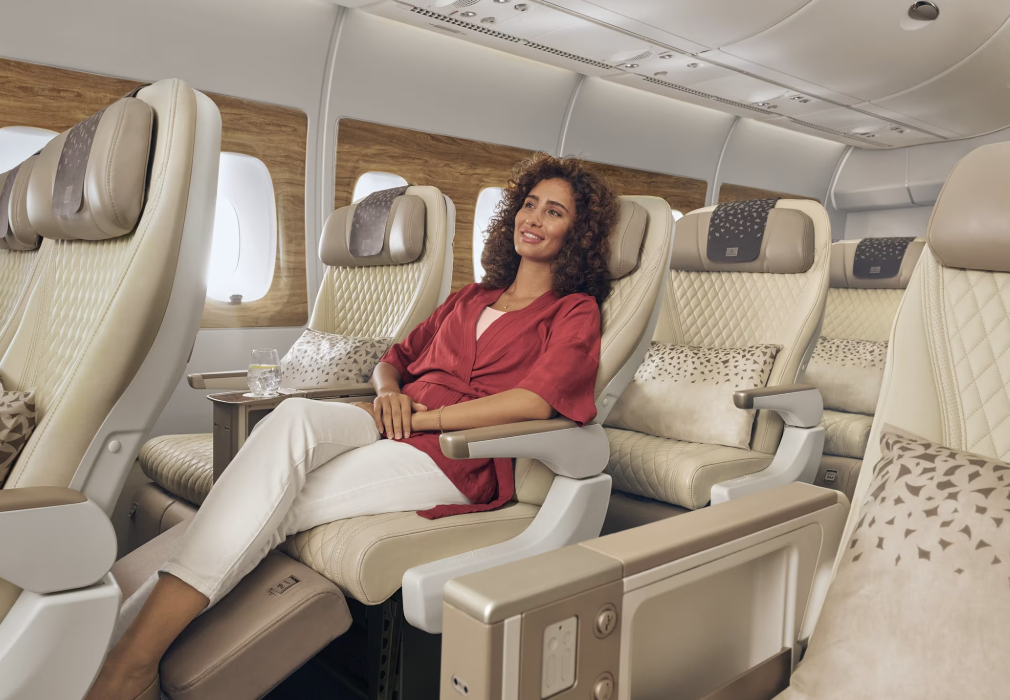通常のエコノミーより広いシートと落ち着いた空間が魅力。サービスや食事もエコノミークラスと少し異なり、価格と快適性のバランスが良いため、長距離路線で選ばれやすいクラスです。