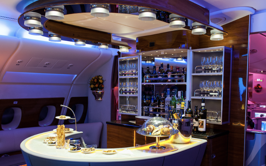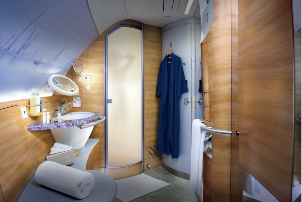 全席個室のスイート仕様。機内シャワーが利用でき、ドンペリやキャビアなど高級レストラン級の食事など、移動そのものが特別な体験になる世界最高峰クラスのサービスが特徴です。