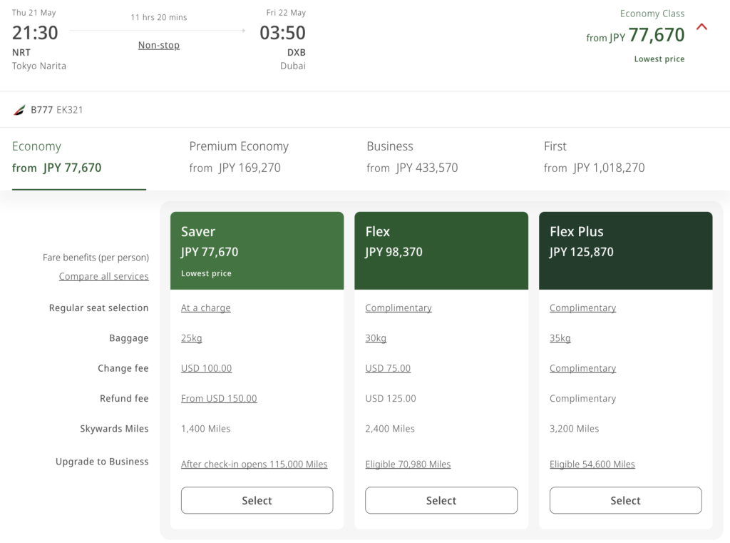 - エミレーツ公式サイトで最終価格をチェック