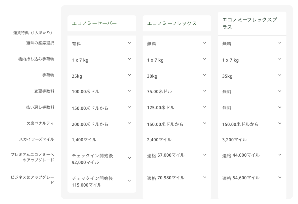同じエコノミーで数万円の差が出ることがあります。安さ重視ならSaver、予定変更の可能性や荷物の重さを考慮するならFlex以上が安心です。また、エコノミークラスの満席時や社内調整でアップグレードが行われる際は、スカイワーズメンバー(上位ランクから)、該当者がいない場合はFlex Plusから順に一定の基準のもとシステムによってお客様が選定されます。
