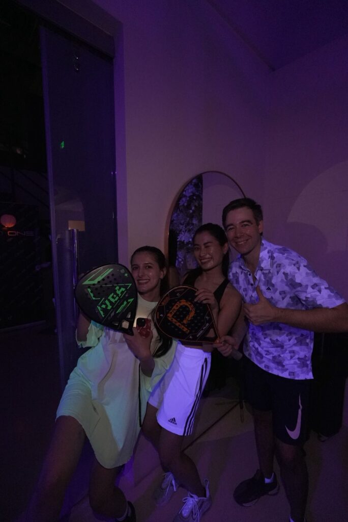 暗闇にしたパデルコートをライトで演出した非日常空間の中で、スポーツ・グルメ・音楽を融合させたオールインワン体験を提供。競技ではなく「暗闇パデル体験」として気軽に参加できるイベントで、約50名が参加しました。
