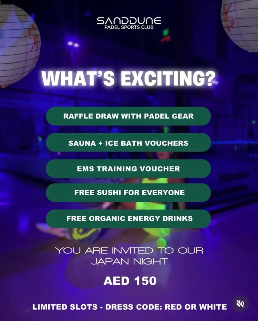 2025年7月11日、ドバイの Sanddune Paddel Club Dubai にて、コラボイベントとして日本文化をテーマにしたソーシャルイベント「Japan Night」を開催しました。
